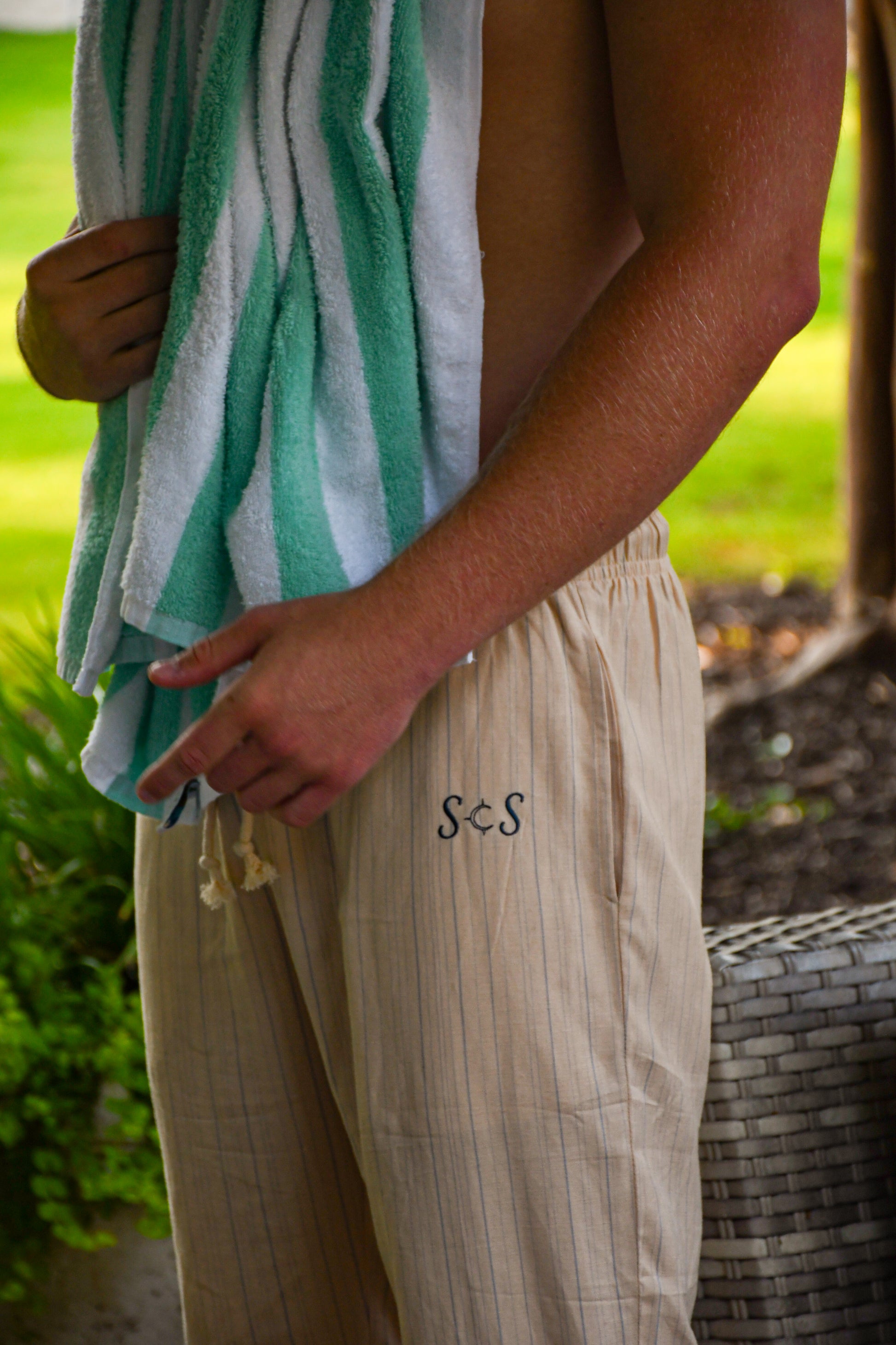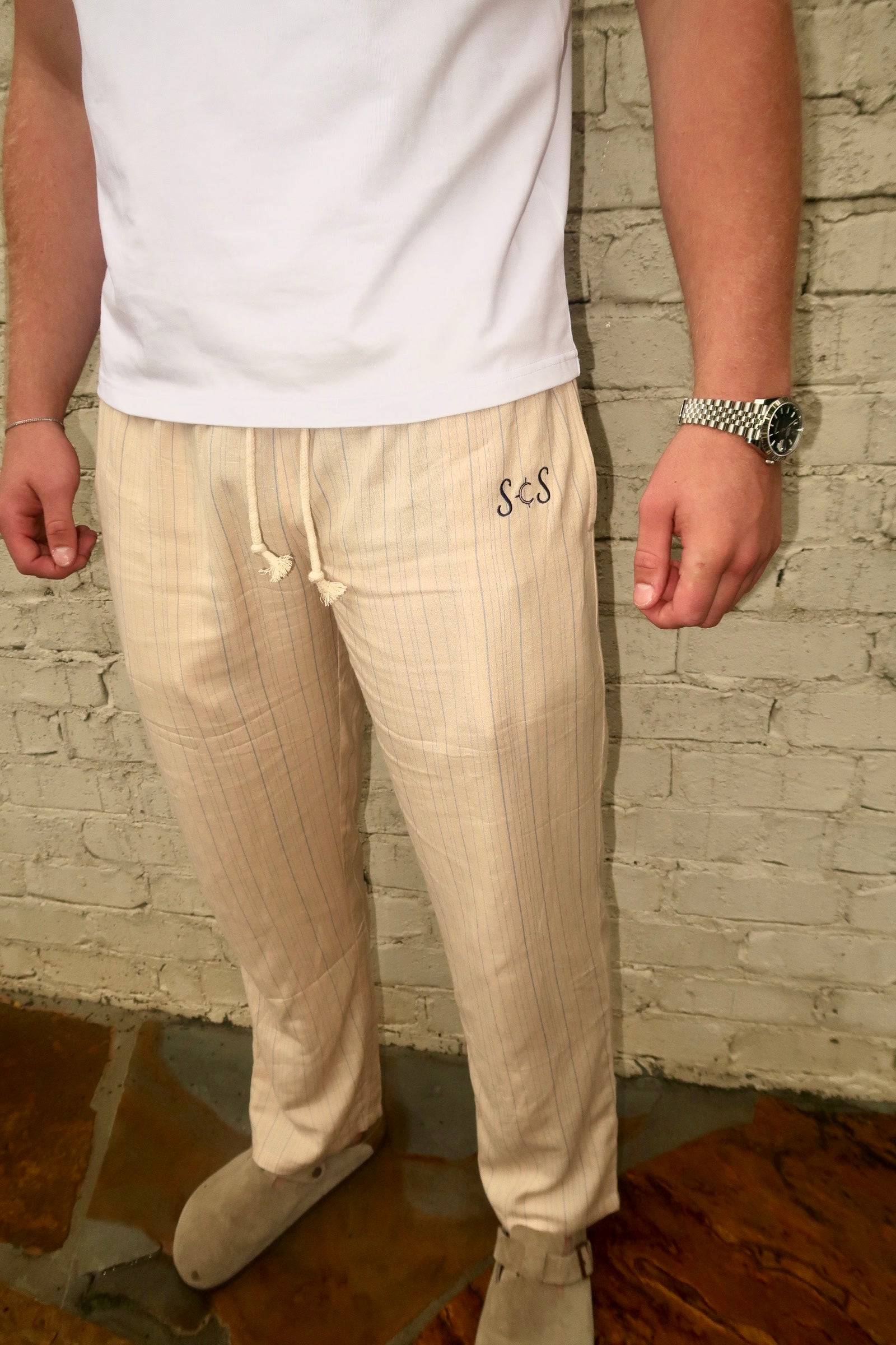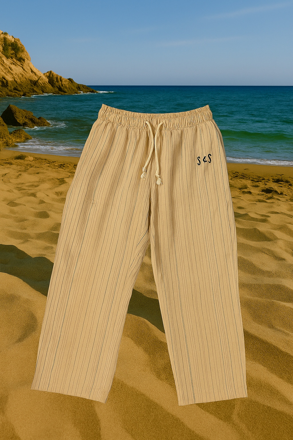 Cut from a soft linen-cotton blend with a subtle stripe pattern, these pants are designed to move easily between settings — relaxed enough for barefoot mornings, refined enough to wear out. The fabric is light, but never flimsy.